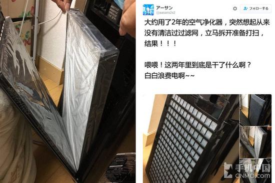 雾霾来袭,北京最近的天气时好时坏,空气净化器成了各家的标配。最近微博上爆出了日本推特网友打算清洁使用了两年的空气净化器的时候发生的一桩惨案。当博主打开空气净化器时,发现里面过滤网的塑封膜竟然没有撕开,也就是说这两年净化器等于白白运转,还费了电。