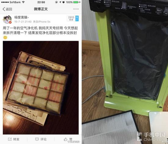 看了他的悲惨遭遇,很多网友在幸灾乐祸的同时,纷纷打开自己的空气净化器,结果却有很多人悲催的发现自己居然也犯了同样的错误。以为呼吸到了新鲜的空气,结果却是塑料膜的味道!