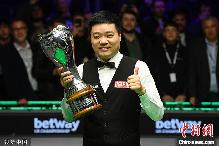 资料图:丁俊晖捧起奖杯 图片来源:视觉中国
