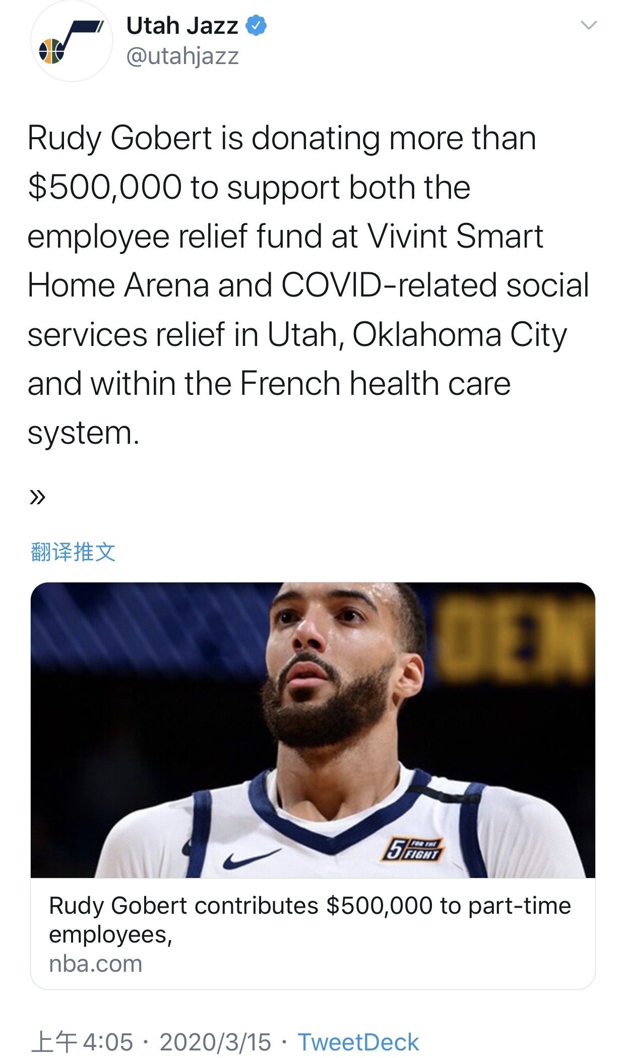 今天凌晨,犹他爵士队宣布,此前确诊患新冠肺炎的球队中锋鲁迪-戈贝尔将为抗击疫情捐款共计50万美元。其中20万美元用来保障爵士队主场兼职员工,20万美元用来帮助犹他州和俄克拉荷马城当地受疫情影响的家庭,剩余部分用于支持法国医疗系统。