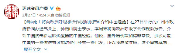 2月27日,钟南山应邀向欧洲呼吸学会介绍中国经验。