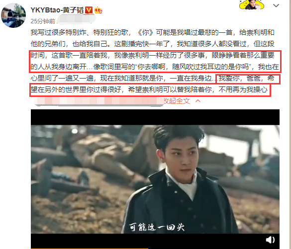今日,黄子韬微博发表新歌,并借用新歌表达了对爸爸的想念,“这段时间这首歌一直陪着我,我像崇利明一样经历了很多事,眼睁睁看着那么重要的人从我身边离开…像歌词里写的‘你去哪啊,随风吹过我耳边的是你吗’,我也在心里问了一遍又一遍,现在我知道那就是你,一直在我身边…我爱你,爸爸,希望在另外的世界里你过得很好,希望崇利明可以替我陪着你,不用再为我操心。”