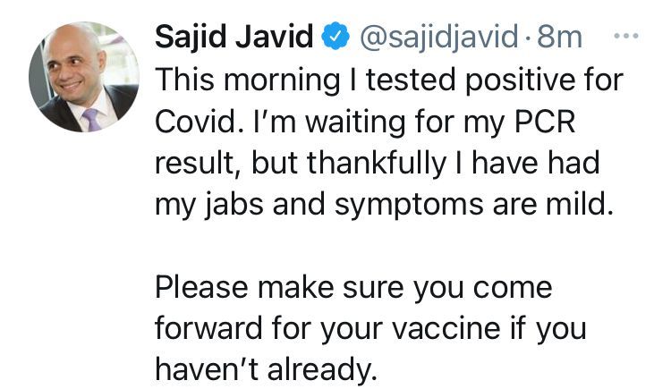 贾维德在推文中写道:“今早我新冠检测呈阳性。我还在等待我的PCR检测结果,但还好我打过疫苗,而且症状轻微。如果你还没打疫苗,请务必来打疫苗。”