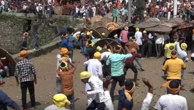根据传统,当地村民分成两队在地上捡石头相互投掷,直至对方头破血流。今年节日活动只持续7分钟就造成至少75人受伤。