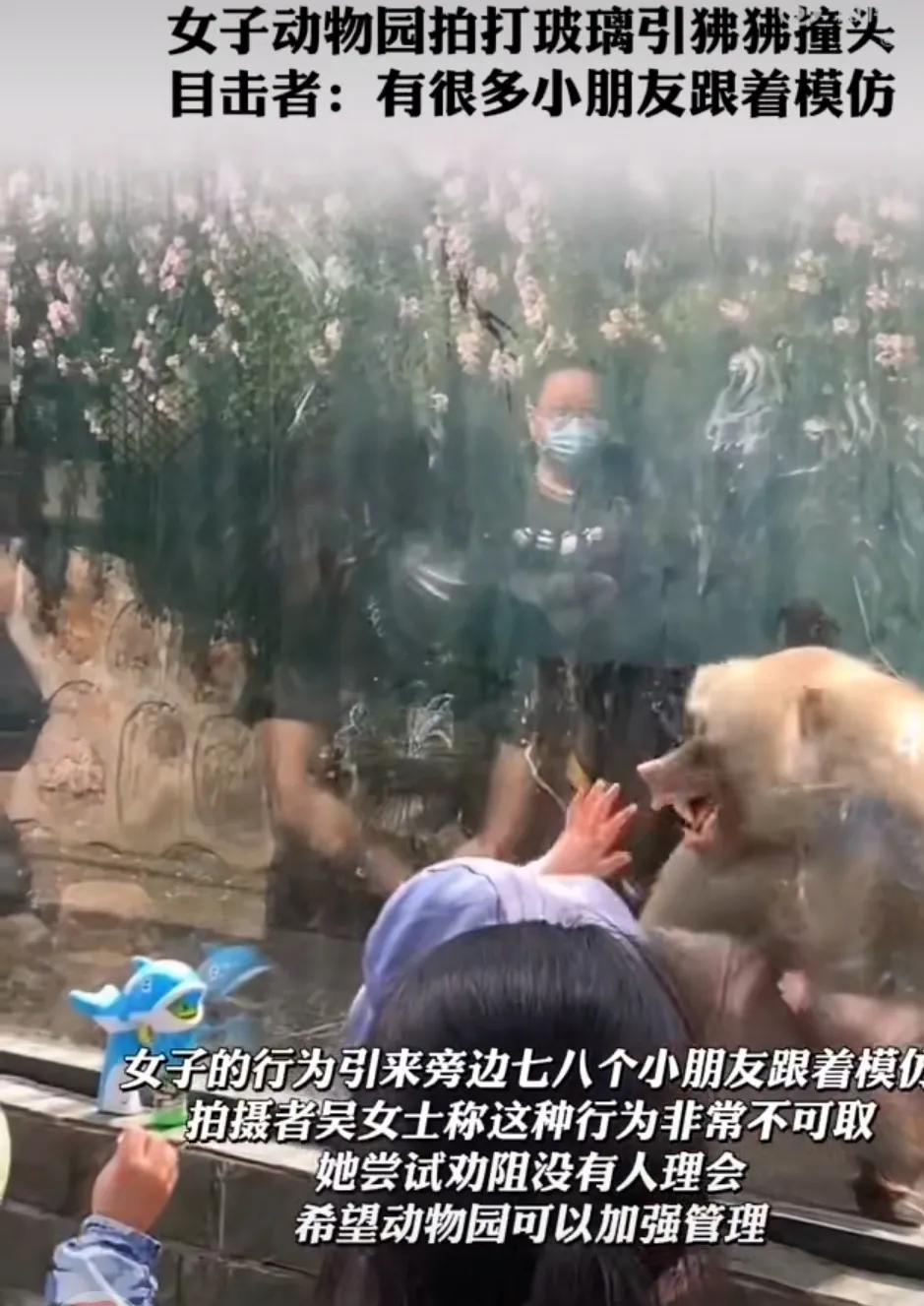 5月2日,江苏无锡。一女士在动物园看到有成年人在用力拍打玻璃想引起狒狒注意,7,8个小朋友在进行模仿拍打,狒狒生气用头不断撞击玻璃。