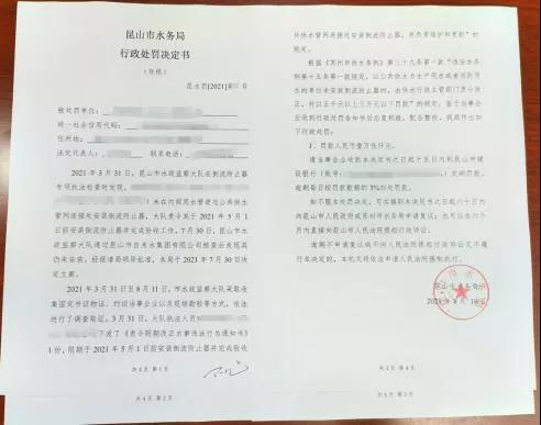 8月20日,由于昆山某企业在整改期限届满时仍未动工安装倒流防止器,昆山市水政监察大队对该企业开具了苏州市首份用水单位未安装倒流防止器的《行政处罚决定书》,并按《苏州市供水条例》规定对该企业作出罚款15000元的行政处罚。最终该企业于9月2日完成整改。