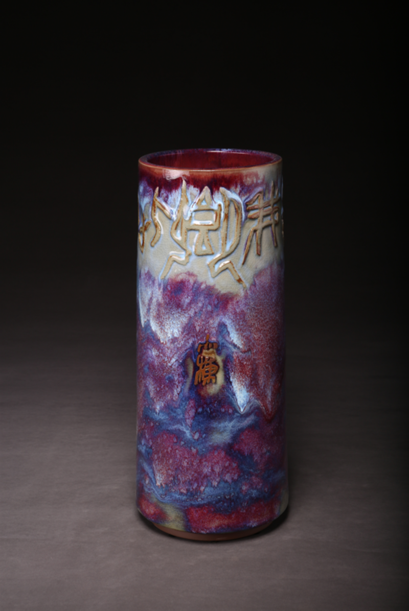 “创作钧瓷书刻作品的过程就是一个排除各类难题的过程。比如印面变形、釉面与书刻如何更好地结合、设计巨印与器型时的成型等等。”沈大栋在谈及创作中碰到的困难时,记忆犹新。当一件件带着吴门气质的钧瓷作品突破层层工序,最终浴火新生的那一刻,他心中的那份激动、喜悦又溢于言表。创作过程中,沈大栋得到了钧瓷烧制技艺国家级非物质文化遗产传承人任星航、河南省工艺美术大师刘红生,以及复兴当代钧窑烧造艺术的非遗传人的大力协助。正是在与他们的一次次深入探讨之中,沈大栋获得了全新的实践灵感。截至目前,沈大栋创作钧瓷印章作品约250方、观赏器书刻作品约35件、文房器等作品约100件。