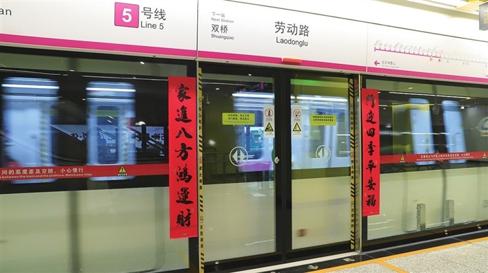 5号线劳动路站的值班站长杨苗告诉记者,劳动路站的换乘客流量非常大,日均约有两万人次,这些新年装饰是在地铁运营结束后车站工作人员布置的,“离过年还有10天左右时间,我们想让乘客在乘坐地铁时能够感受到浓浓的年味”。不仅如此,下周二下午1点在劳动路站换乘通道内还会举行“写春联、送祝福”的活动,感兴趣的市民可前往参加。