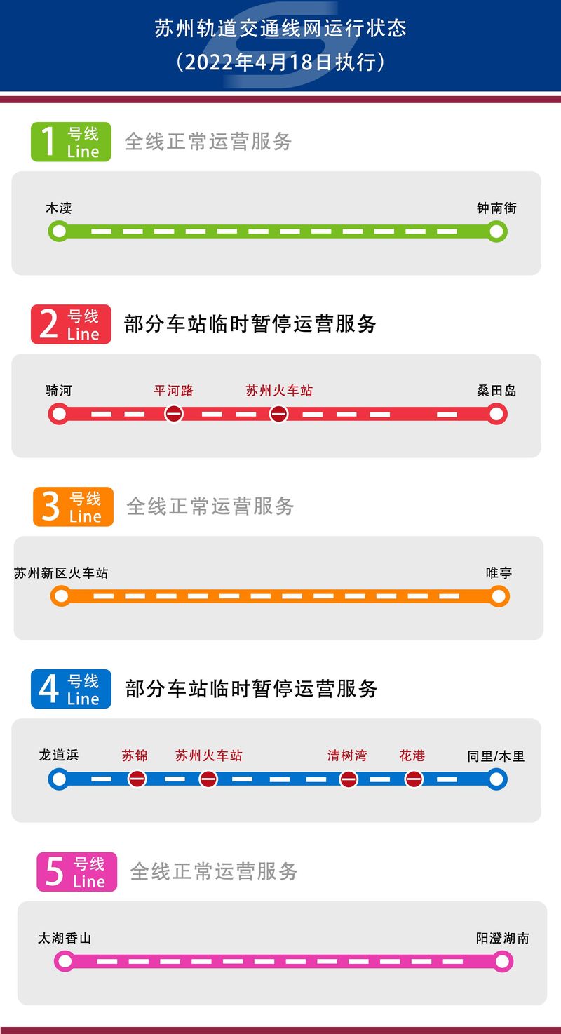 同时,2号线平河路站、4号线苏锦站、花港站和2、4号线苏州火车站站仍暂停运营服务。