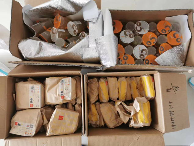 在金怡苑小区,爱心商户唯车汇为奋战在“疫”线的大白们送来了100余份暖心的奶茶和汉堡。